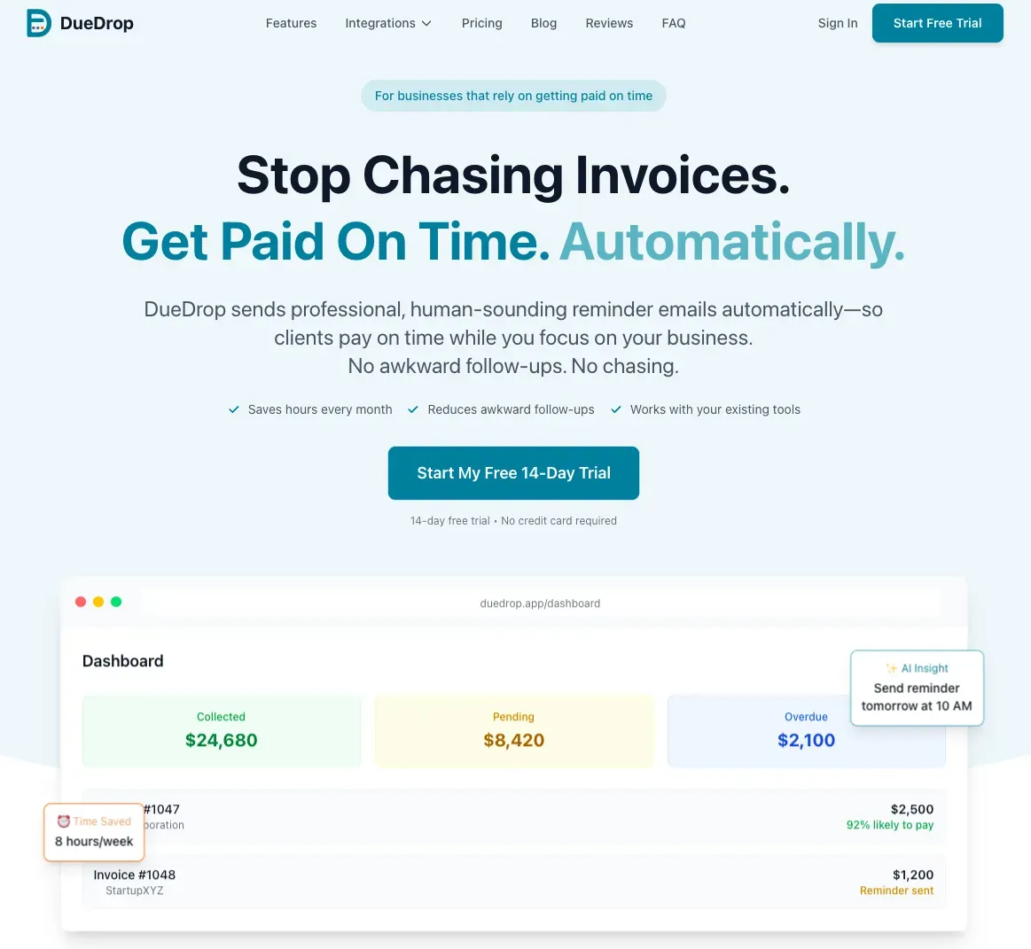 DueDrop automates personalized invoice reminders sent from your own inbox, helping service businesses get paid faster without damaging client relationships.